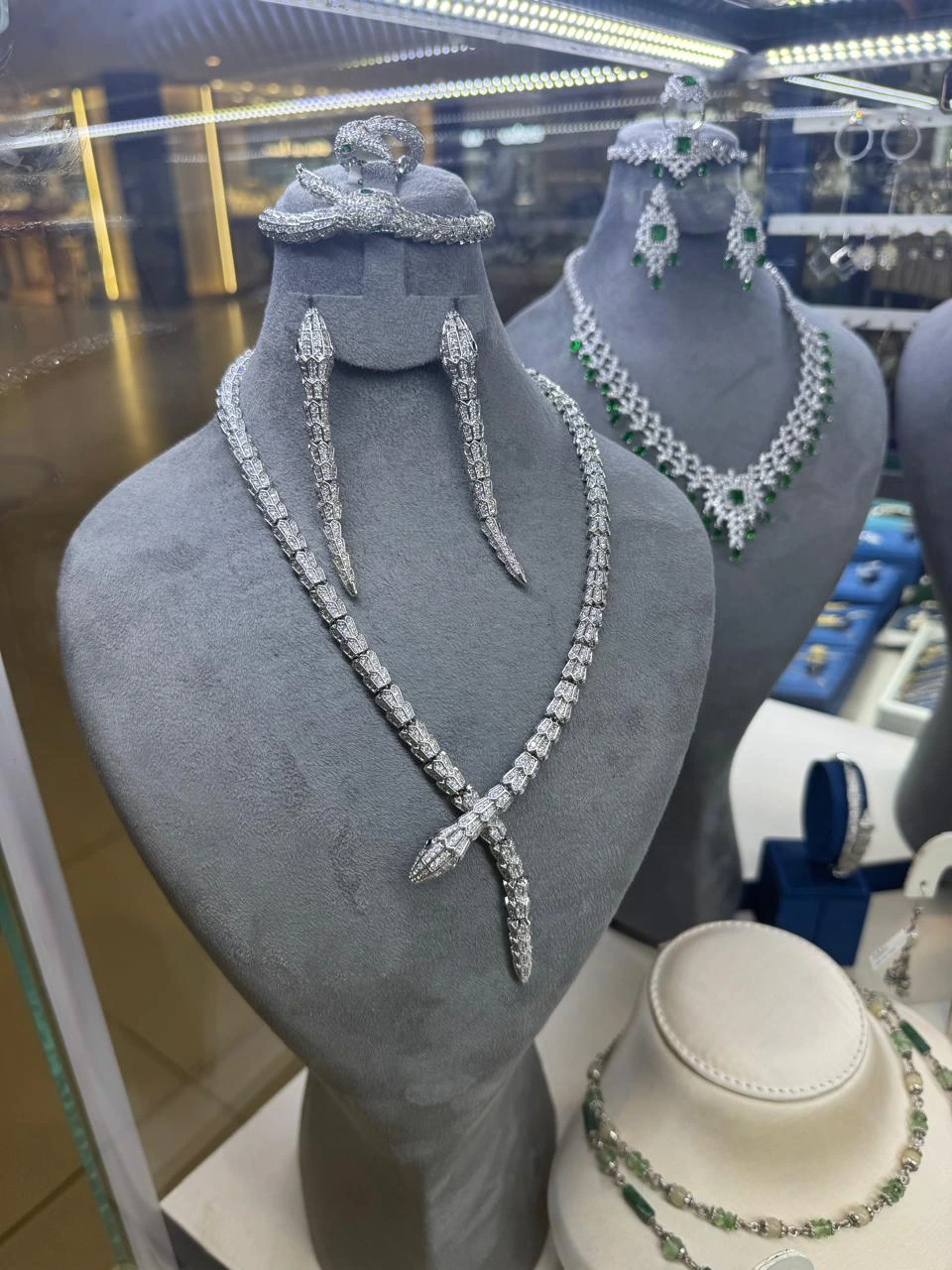 This exquisite diamond jewelry set is crafted with precision and elegance, featuring a striking snake-inspired design. The set includes a statement necklace, matching dangling earrings, and a bold cocktail ring, each piece reflecting timeless artistry and luxury.