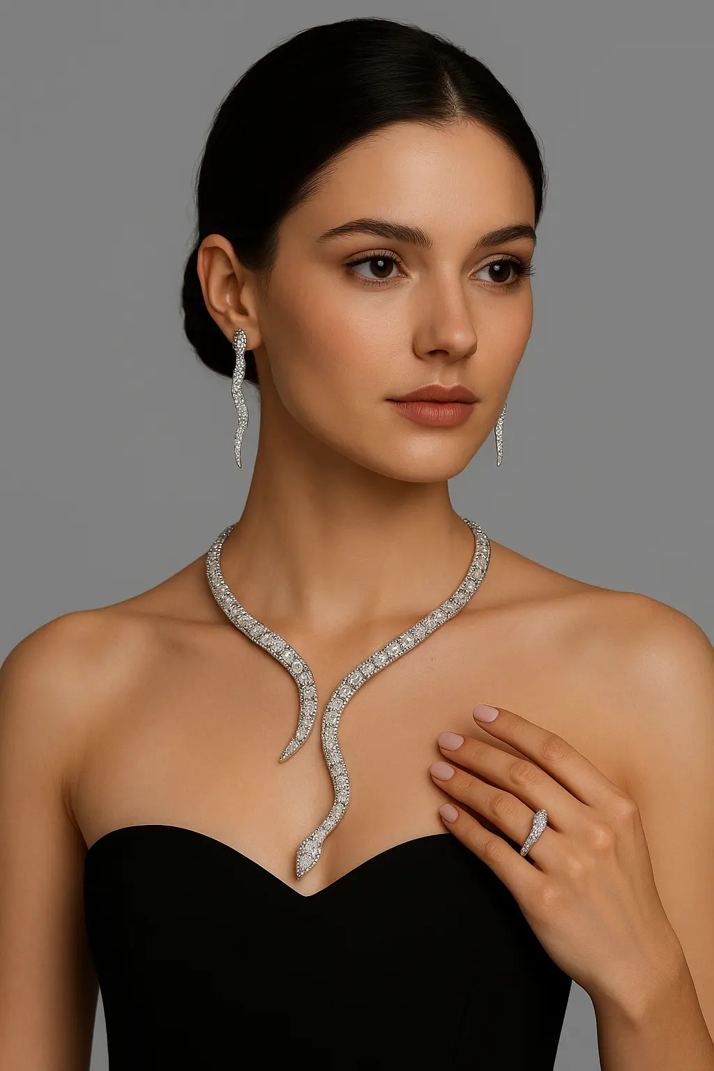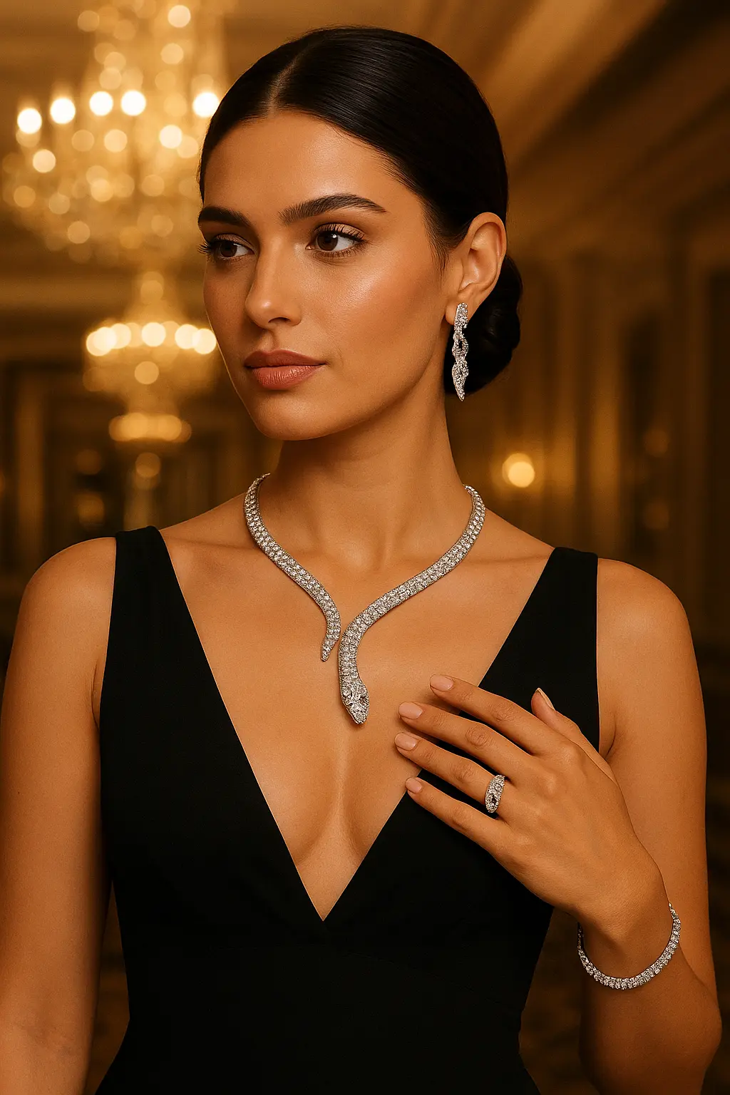The necklace gracefully wraps around the neckline with detailed diamond settings, while the earrings add a touch of sophistication to complete the look. Designed to symbolize strength and elegance, this jewelry set is ideal for weddings, evening parties, and high-profile events.