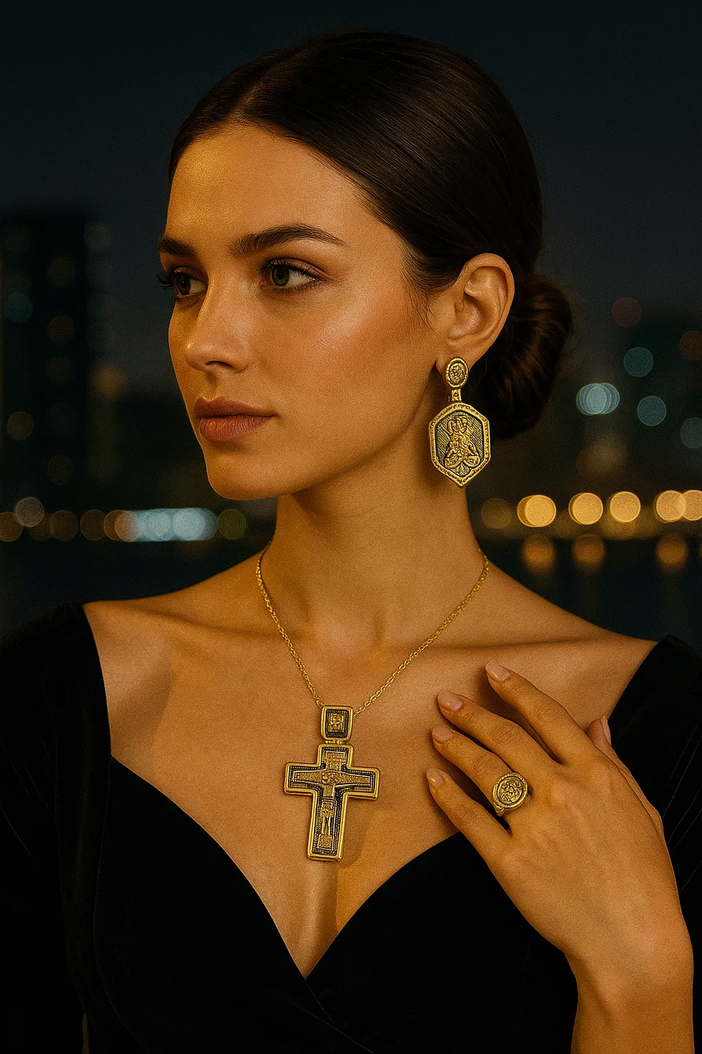 Luxury Orthodox Cross & Saint Pendant Jewelry Set in Gold
