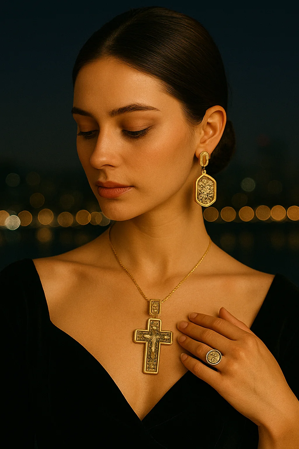 This exquisite jewelry set showcases timeless Orthodox artistry with a detailed gold cross pendant and matching Saint pendant. Crafted with precision, each piece features fine engravings that reflect devotion, heritage, and elegance. The set is designed for those who value spiritual symbolism while appreciating luxury craftsmanship. Perfect for special occasions, gifting, or as a unique statement of faith and style.